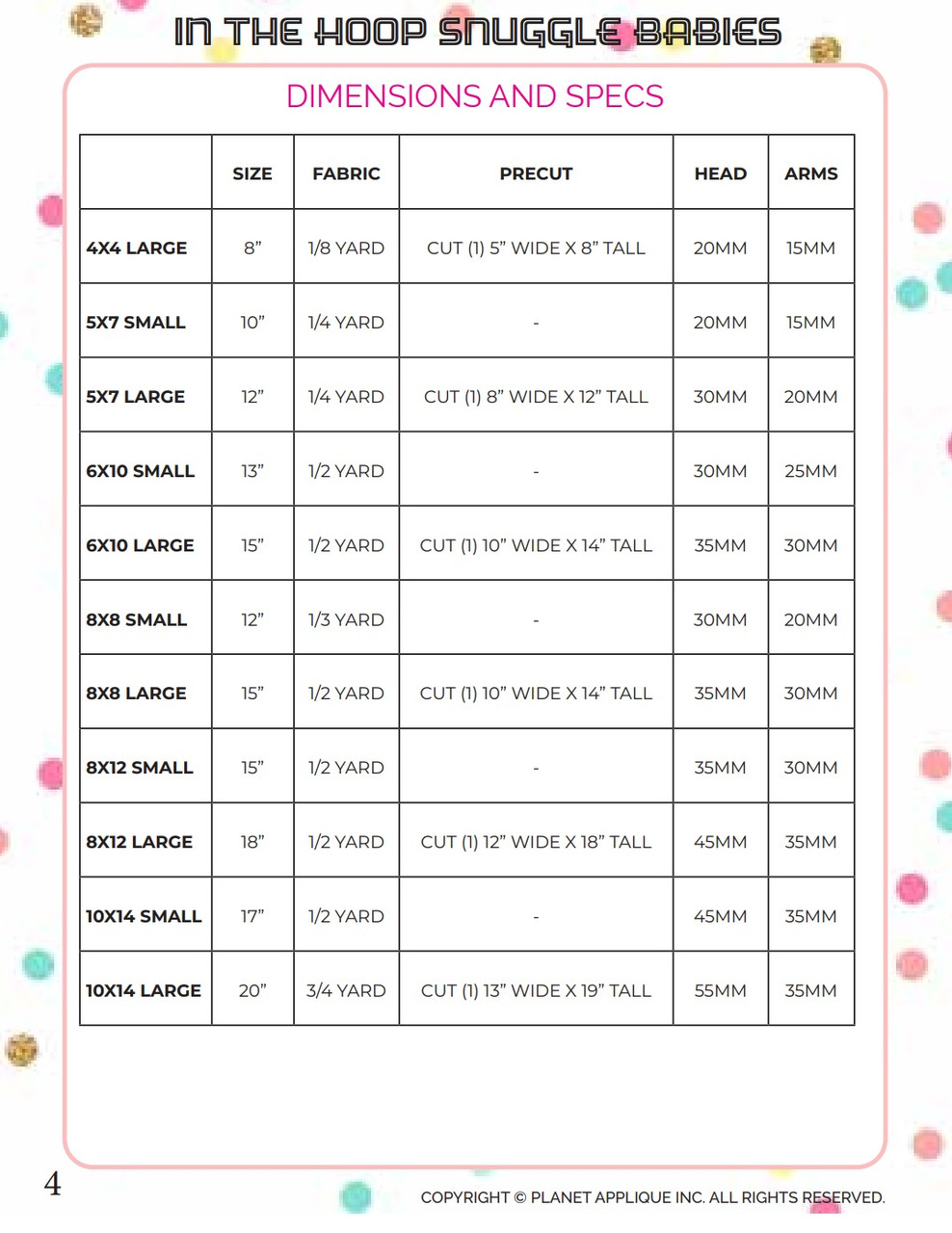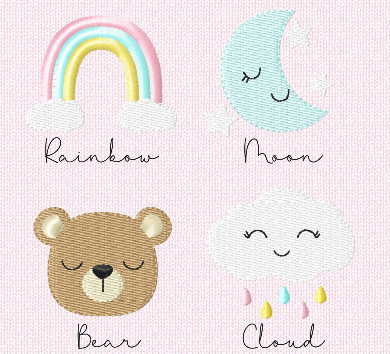 Do you struggle with not being able to cloth your smaller dolls or having to make custom clothing for your cloth dolls? Snuggle Babies is the answer! Never worry about clothing again with this unique and original machine embroidery design that is engineered with a built in sleeper body! This design set include 5 different types of babies to make. You can make a bunny, a mouse, a kitty, a bear, a bald baby, and a baby with fabric minky hair. What's more is that it is for the 4x4 hoop and up with most hoop sizes able to make 2 different sizes. Snuggle Babies come with the option to make either sewn in arms to the body or doll joint attached arms to the body. The head is attached via one doll joint, but you can also sew the head onto the body by aligning the support circle on the back of the head and the one on the body and then using a ladder stitch to secure it. There are no special supplies needed and it's all made in the hoop on your embroidery machine! We even pioneered a new technique for making the feet on our Snuggle Babies 3D!! The faux folded over chest is engineered to look like a snap down sleeper but cannot be opened, thus making these babies a safe option for small children. The snaps on the chest are optional, or you can stitch the embroidered buttons instead for further peace of mind. The special snuggle body has 4 options for the chest patch: moon, rainbow, bear or raincloud, or you can edit the file and add your own favorite small embroidery design or monogram! Snuggle Babies are quickly becoming one of our best sellers! Don't be fooled by imitations! Our Snuggle baby is an authentic original handmade embroidery design we slaved over to get just right for our customers! Comes with extensive color tutorial with a photo for ever step! Video Tutorial is also available on our Youtube channel or you can view them below the description!